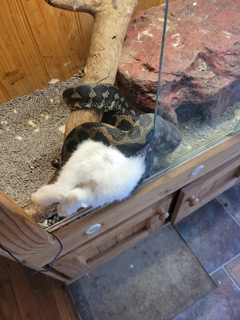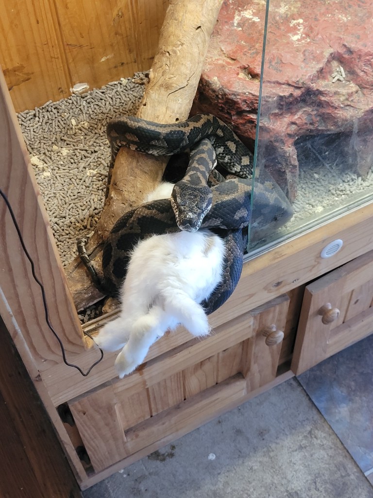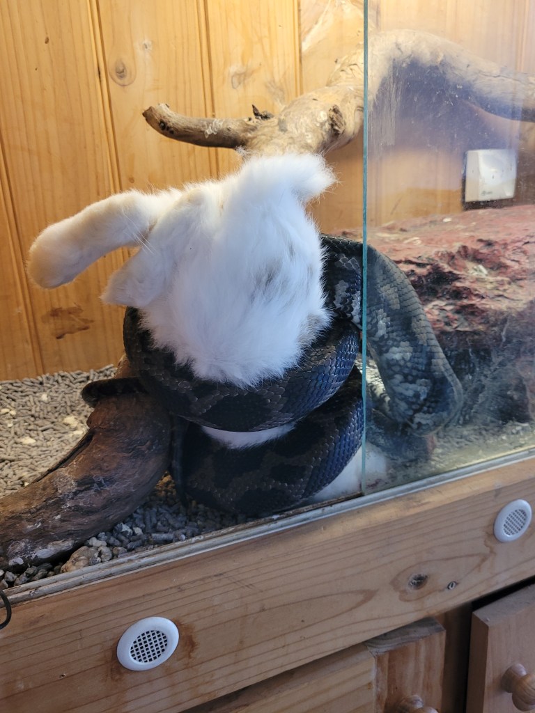 Humans have evolved to not need to eat animals… snakes haven’t š Took his time coming out to get itI didn’t manage this quite right šTried to close the glass but can’t…Sebastian stop looking at me! I’m not dinner šHope Sebastian drags the rabbit back in as I really need to close the enclosure š