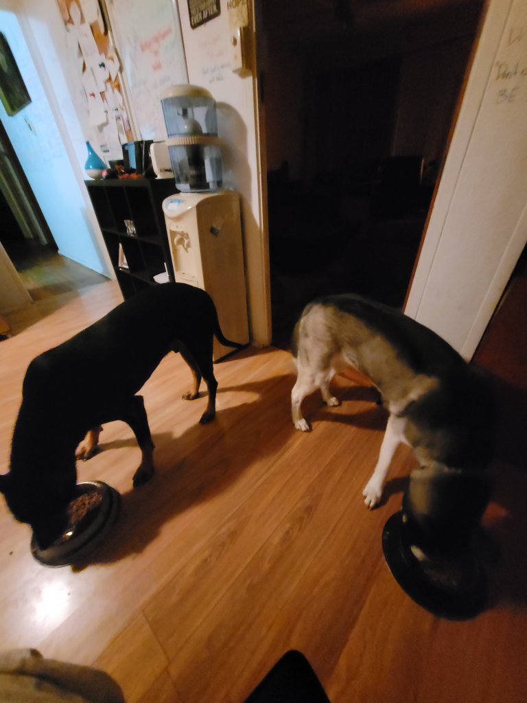 Diesel takes one biscuit at a time and then walks away. When he does, Boss switches to his bowl.