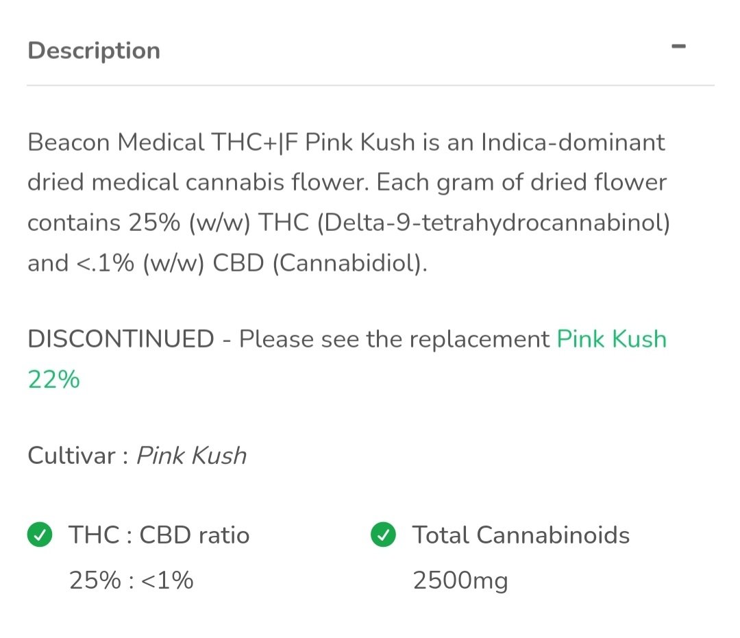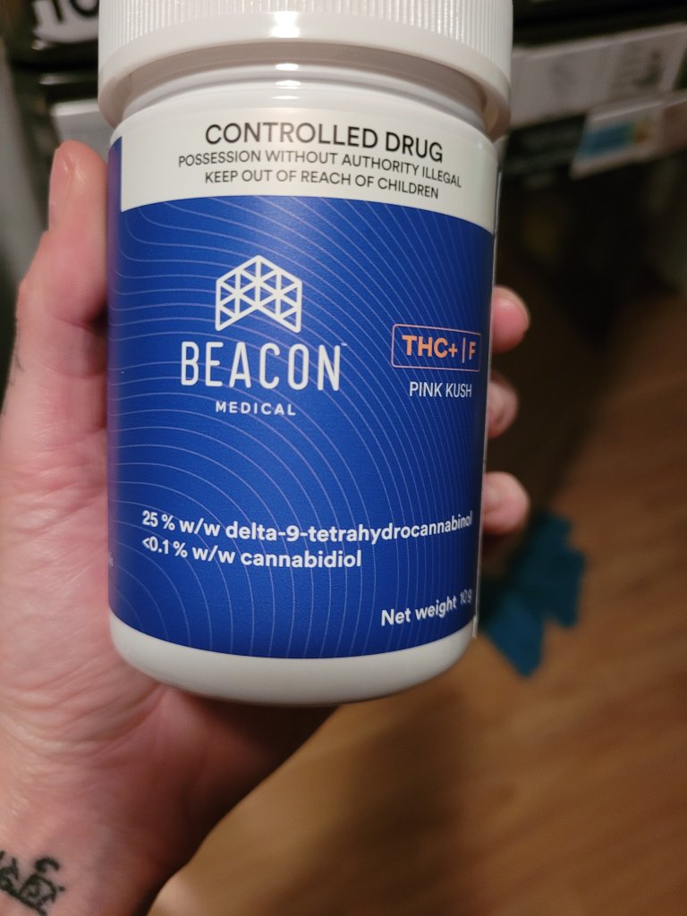 Since I am going to trial using the thc and cbd oils throughout the day and continue to vape minimally in the evening, I went ahead and ordered the best prescription weed I’ve ever tried, that is for evening use, when I’m ready to completely unwind. I am prescribed two 10g containers a month, but since I already have some left, I only got one. Turns out, according to Canna Reviews, the current Pink Kush 25% THC has been discontinued and replaced with a 22% kind.