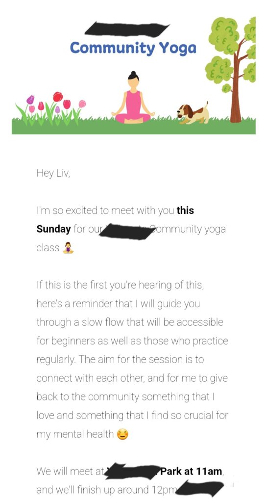 I absolutely love yoga! It is incredibly good for breathing exercises too!! Plus it’s being held in a park!! Though Grant did tell me that since I’m booked in for the vaccine that allows me into some more places but I’m not sure about that 🤔