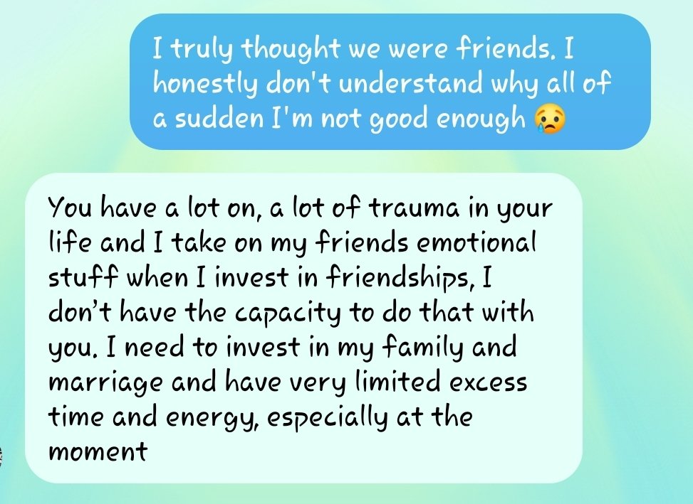 I messaged to ask if she wanted to catch up for coffee tomorrow morning so Boss and Charli could play. I definitely wasn’t expecting her to reply by ending our friendship and her saying it’s because she wants a simple life so can’t have me in it.