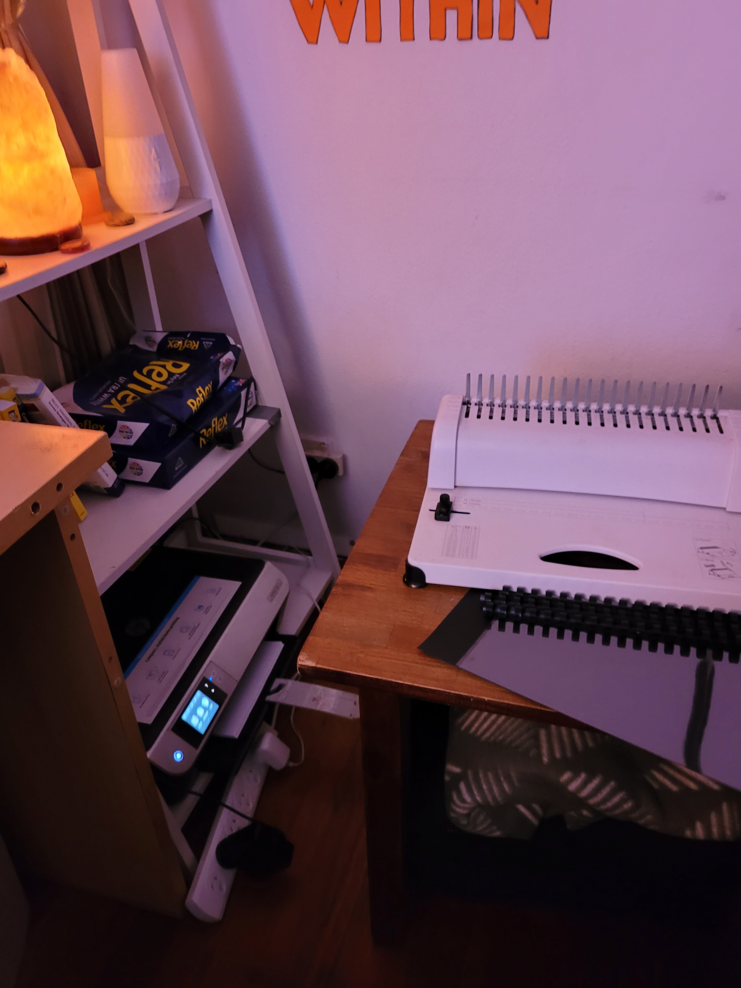 I mean my desk and office chair are here. My printer is here. The binding machine may as well be here too. At least for now ššš¤·āāļø