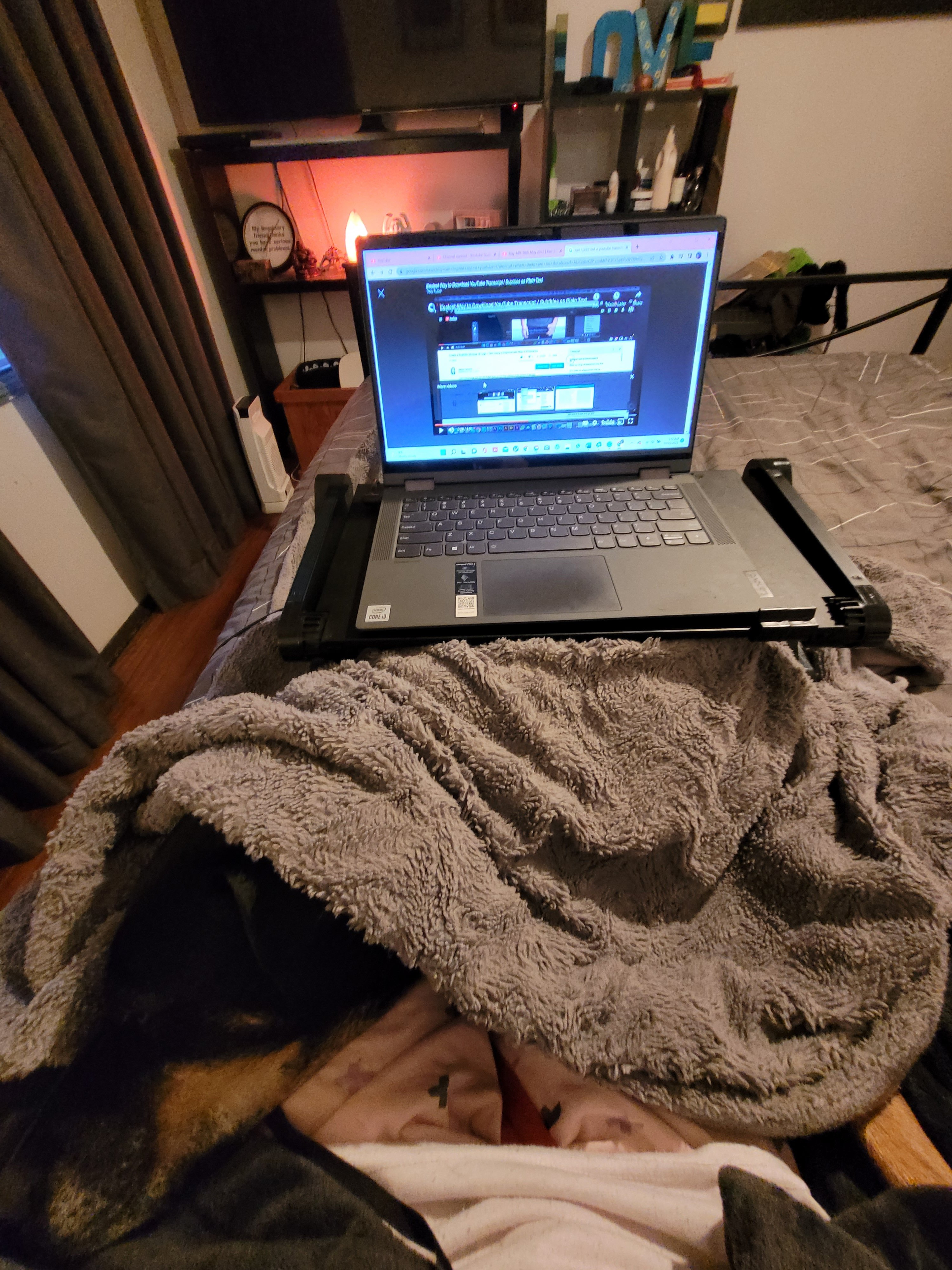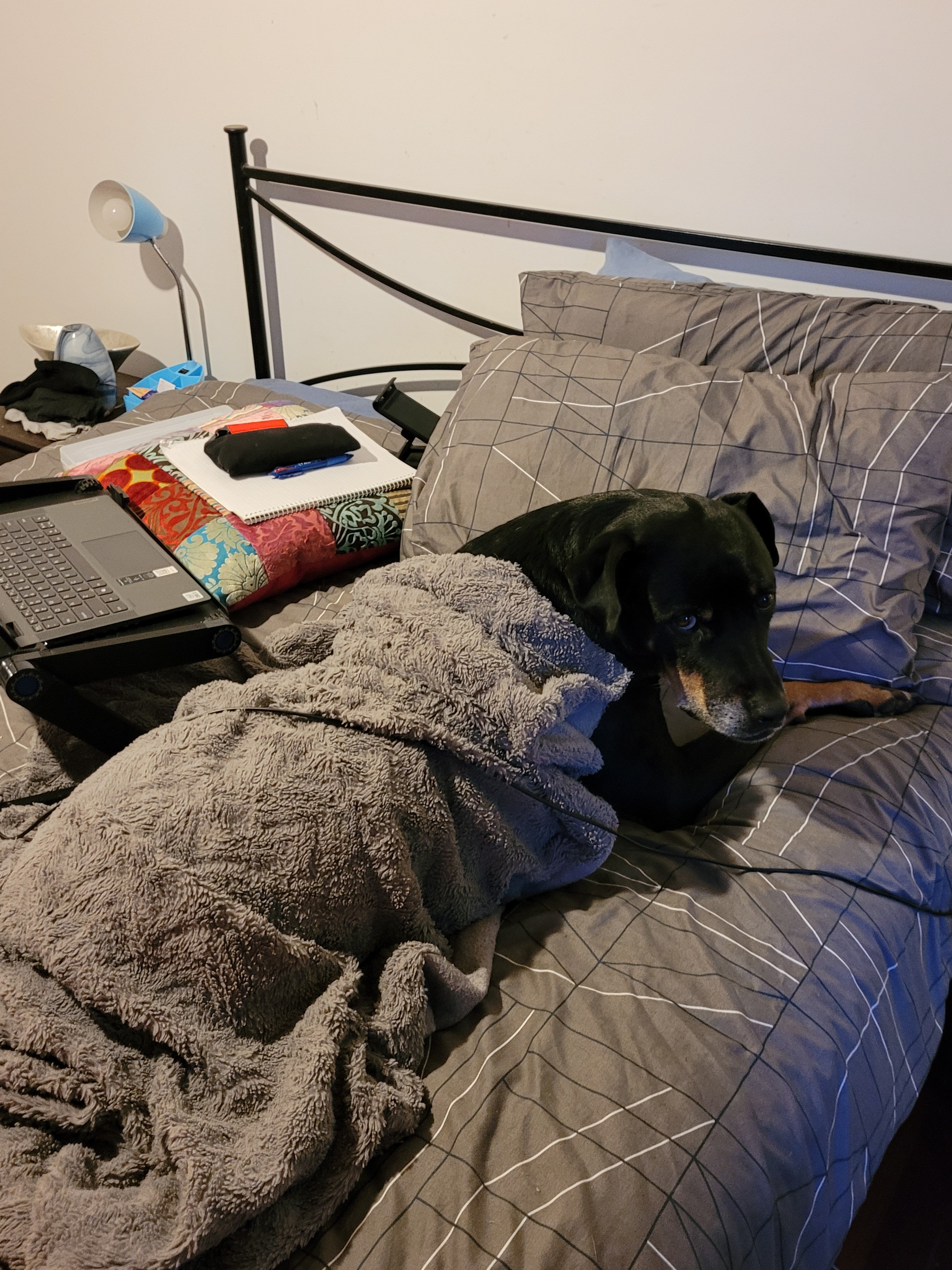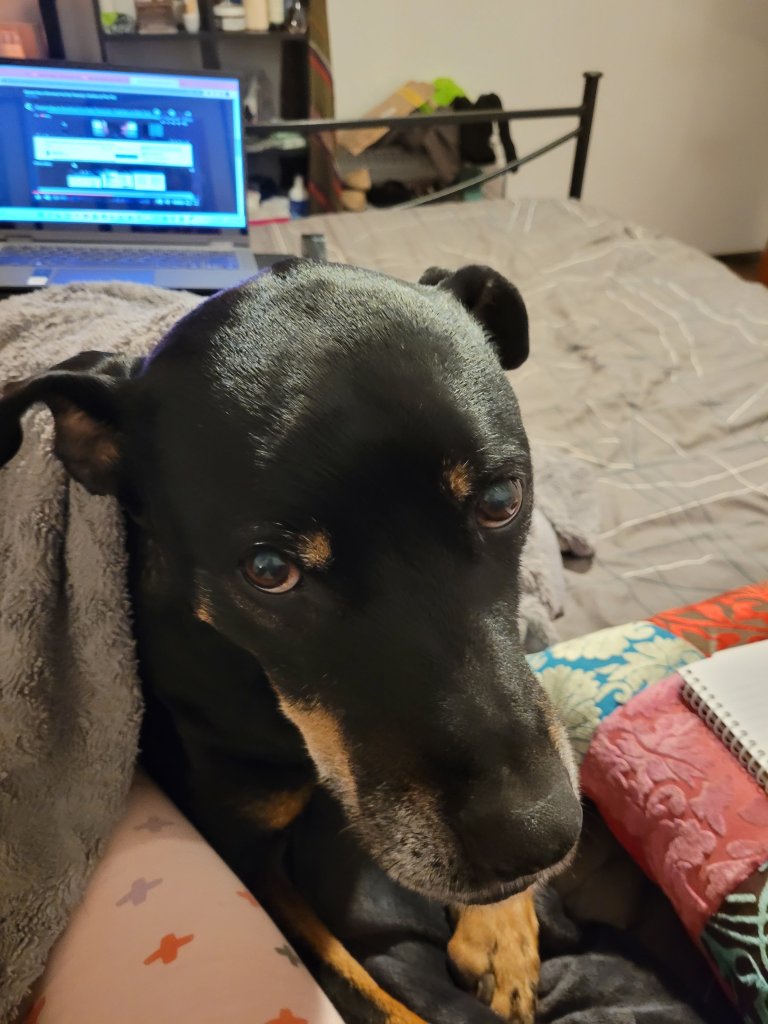 But Boss decided he wanted morning cuddles this morning, as well as being under the blanket, even though my bed is already made, so now he’s got the throw blanket over him, with his head on my lap, making using my computer quite difficult š