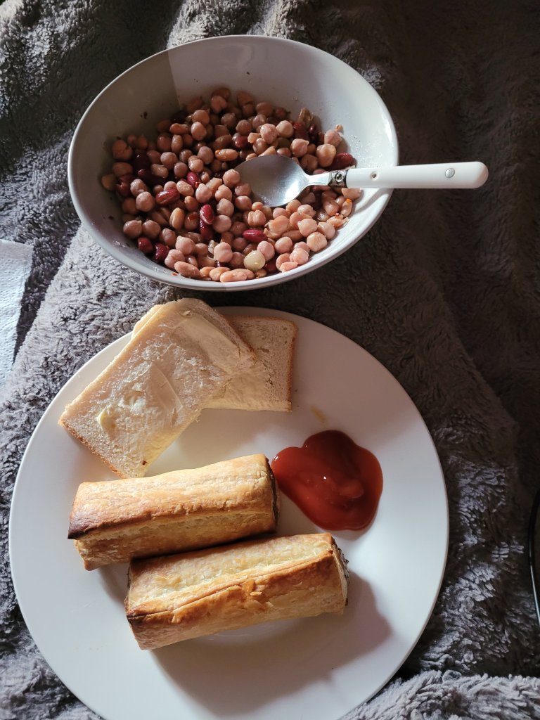 Boss is lying to the right of me. I’m actually in bed to save power by not using the heater, and my laptop is on the stand, paused on this mornings video with approximately three minutes left on it. I had to turn oven off and put Friends on to watch with dinner, before I was completely finished watching it. I thought I would watch it then the next two after dinner but I don’t feel up to it.
