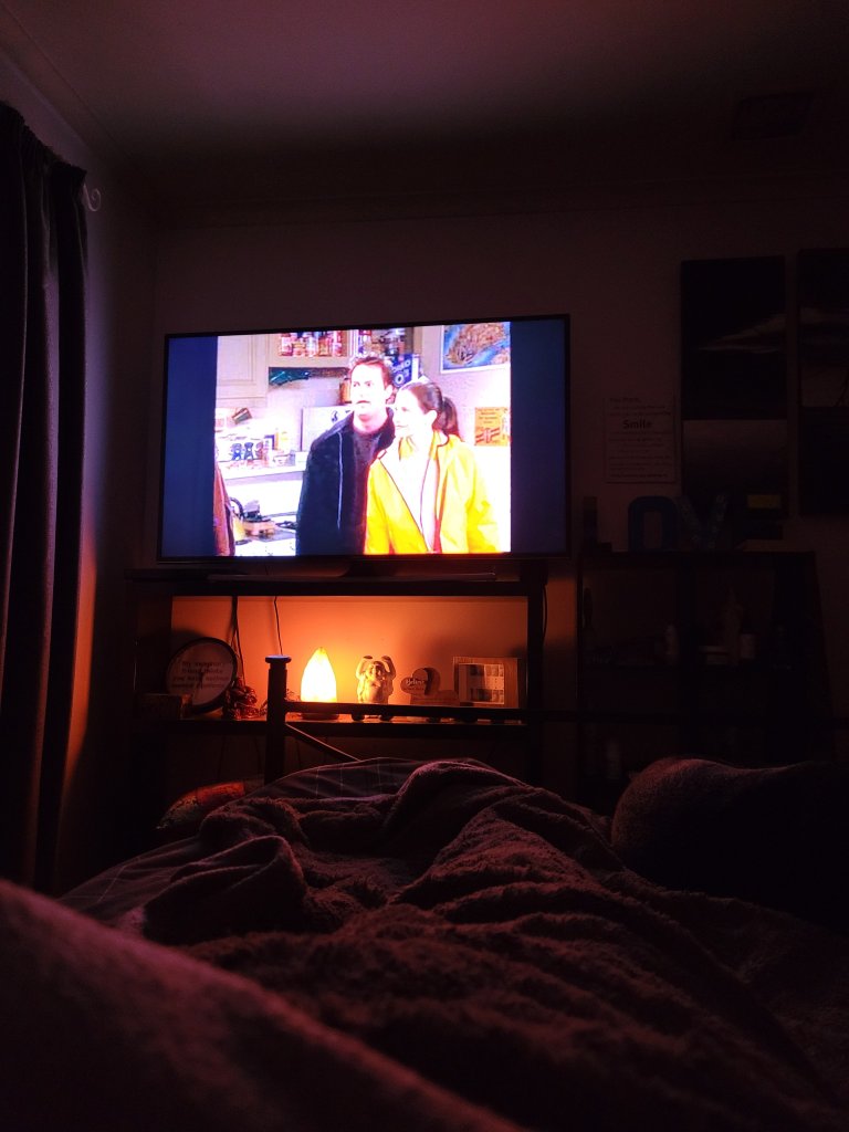 At this moment in time, 22nd of May 2022, at 5:28 pm, I am lying in bed. Friends is playing on my tv from my hard drive. It’s interesting because it’s quite blurry on the tv yet looks perfect when played on the laptop.