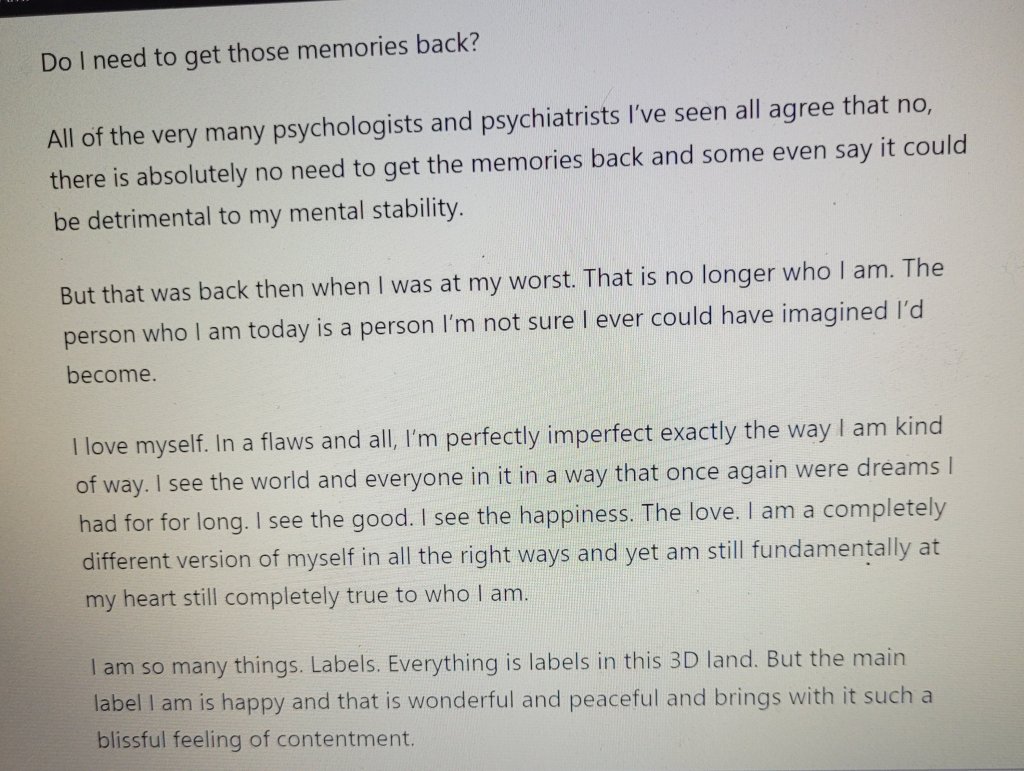 Stories with titles such as ” The majority of my childhood memories have been locked away for as long as I can remember” I am able to step outside of myself and read them from a third person’s point of view.