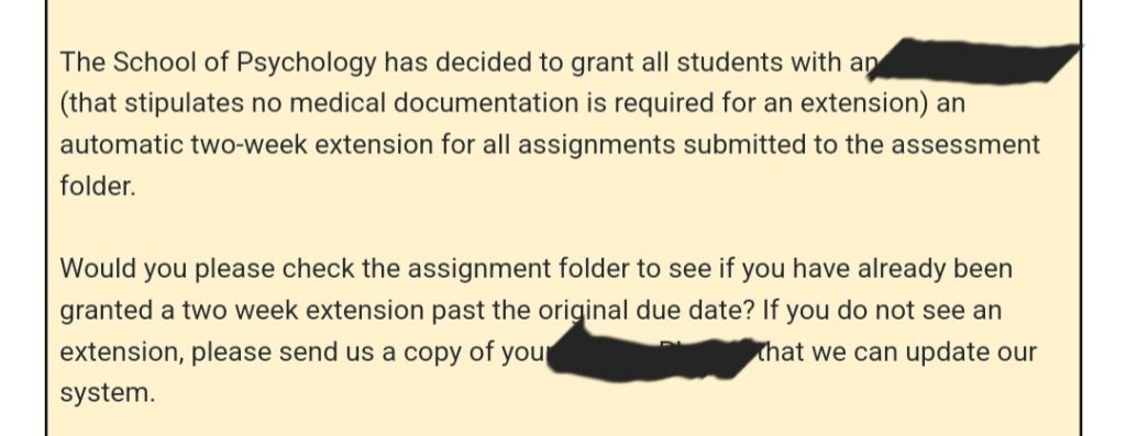 It actually turns out that the psychology department at my university has decided to give all students who have a disability support plan in place that allpws them to request extensions without having to get medical paperwork everytime, which is what I have, are automatically being given the extra two weeks for all assignments moving forward! How amazing is that!!