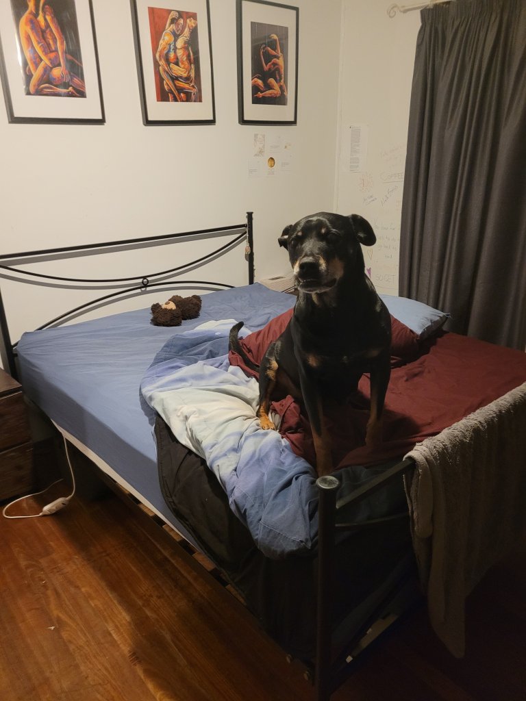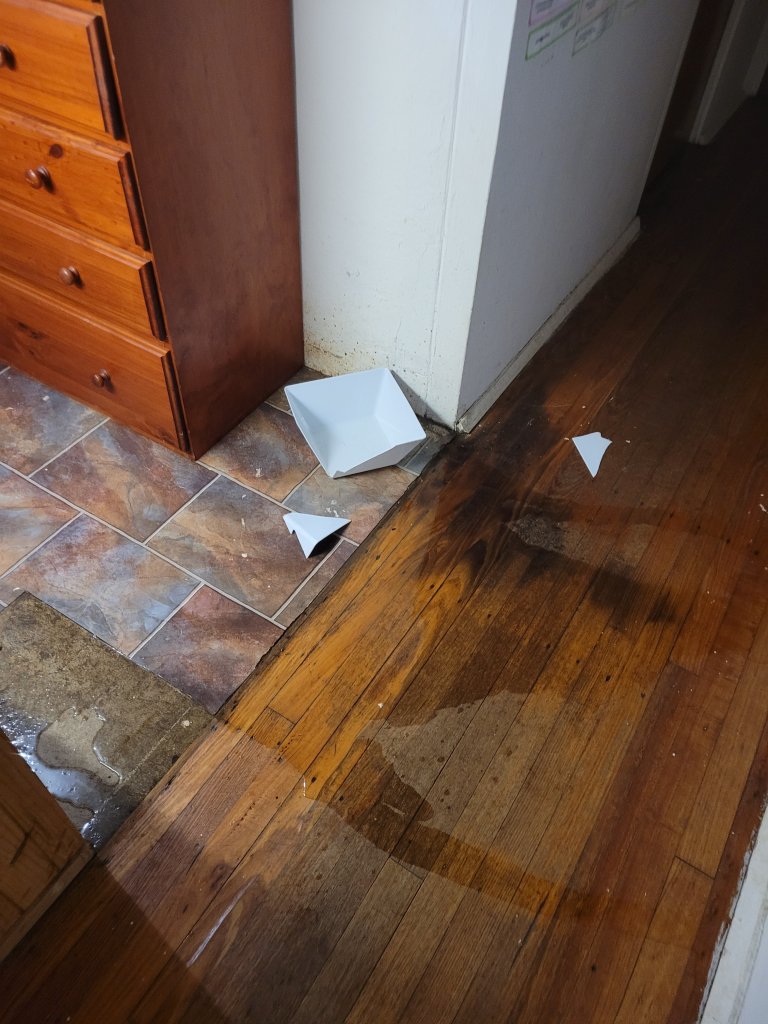 Boss was so happy and excited to see me when I got home from Graham’s place at approximately 9:45 pm, that he went crazy mad zoomies and run so fast from the yard, through the dog door and laundry where his feet slid out from under him as he hit the water bowl which promptly broke spilling water everywhere š