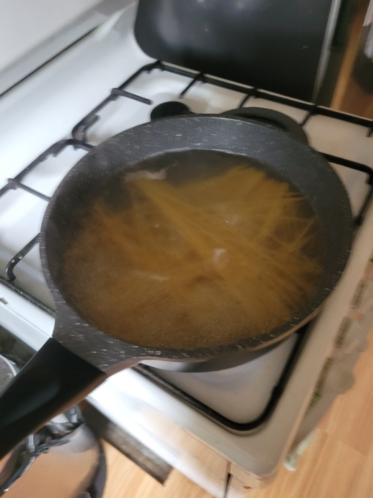 I’m cooking the pasta first and will then use the same pot to cook mushrooms and sauce before adding the cooked pasta back in. Hopefully, it tastes good. I decided I’m going to ask Ellie to show me how to make the pasta she cooked for me since it was so delicious 😋