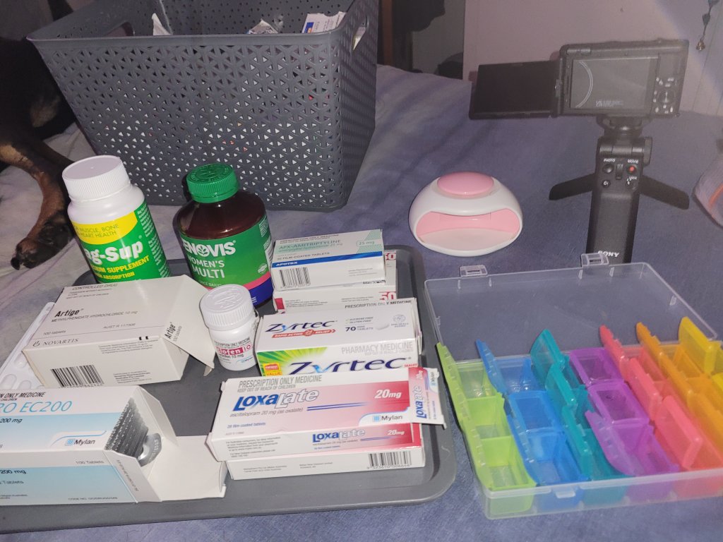 I still need to fill my pillbox, which I have everything organised next to me to do since taking my meds when they aren’t organised is another thing that very easily does not get done, even though I know skipping medication randomly is not safe or sensible at all. I had to take my morning meds with my night meds earlier after I shut my computer down because I am wrecked and really can’t be bothered filling it, even though I know I need to. But in case I don’t at least I’ve had my meds.