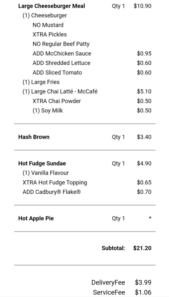 This time I called them though as soon as I placed the order. Last time they didn’t add cheese. I had to order the cheeseburger to get cheese and yet it wasn’t added. Hopefully, it’s right this time. I also plan to add the hash brown to the burger. I’m very excited lol plus chai lattes from McDonald’s McDonald’s are my ultimate favourite hot drink. It is perfect every time from McDs.
